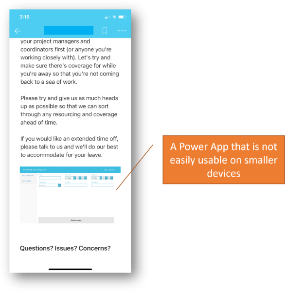 However, they might not be optimized and/or usable in mobile views, depending on how you designed and implemented them. In this example below, a Power App is added to a SharePoint page for requesting time off. However, it was designed for desktop use, and is too small to use on a smaller mobile device like this: