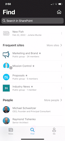 Just like any other website, a user opens the intranet in a mobile browser such as Safari or Google Chrome. After signing in, the page will load in a mobile-friendly view with a responsive page layout. It looks very similar to the SharePoint app when navigating the entire intranet.
