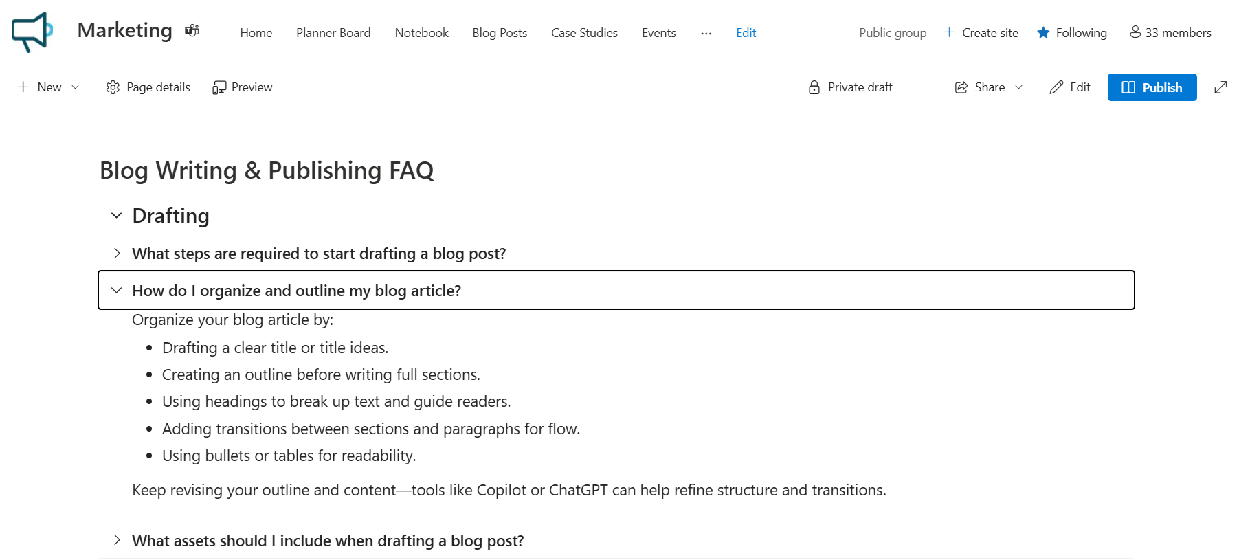 SharePoint adds AI tooling to pages with Microsoft 365 Copilot. Copilot helps users draft pages, generate FAQs, and bring agent links onto pages. The result is less time wrestling with a blank canvas and more time refining the message and experience.