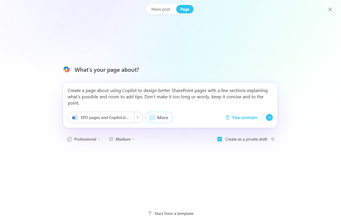 Try using Copilot in context within webparts instead of creating the whole page, which is better for more author control. Section driven design with Copilot is also coming soon.