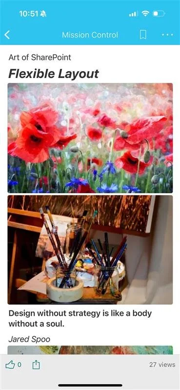 In this example, the flowers would make sense to keep if users could keep control over the displayed size. Unfortunately, SharePoint doesn’t currently allow users to control sizes of images for mobile view without customizations, so in this sample, the decision was made to remove them.